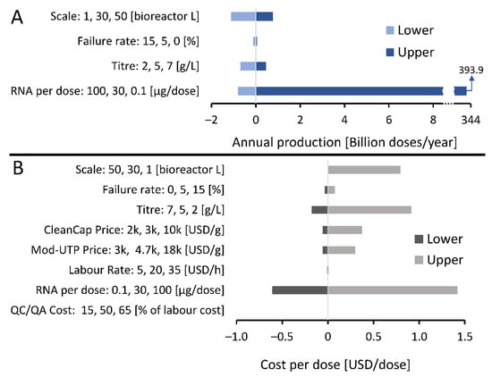 Sensitivity analysis showing RNA vaccine drug substance manufacturing uncertainties and their impact on annual production amounts and costs per dose. Input variables which are uncertain, their uncertainty ranges and units are shown on the vertical y-axis and the outputs of drug substance annual production amounts and costs per dose and shown on the horizontal x-axis. The zero values shown on the horizontal x-axes and the corresponding vertical line indicates a baseline scenario which describes an RNA vaccine production process with a 30 L bioreactor working volume scale, a final titre in the bioreactor of 5 g/L, 44% combined losses in the downstream purification and formulation steps, 30 µg of RNA per vaccine dose, a production process failure rate of 5%, 5′ cap analogue (CleanCap) purchase price of 3000 USD/g, 1-methyl-pseudouridine (Mod-UTP) purchase price of 4700 USD/g, basic labour rate of 20 USD/hour, quality control testing (QC/QA) cost of 50% of the labour costs, and 444–471 production batches completed per year. (A) The impact of uncertainties and their ranges listed on the vertical y-axis on the amount of doses worth of lipid nanoparticles (LNP) formulated RNA that can be produced annually shown on the horizontal x-axis. Results are shown relative to a baseline scenario at zero on the x-axis, as described above. (B) The impact of uncertainties and their ranges listed on the vertical y-axis on the production cost of the LNP formulated RNA drug substance per dose shown on the horizontal x-axis. Results are shown relative to a baseline scenario at zero on the x-axis.