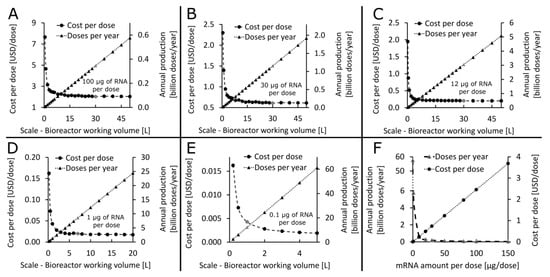 Determining the techno-economically feasible production scale for five vaccines with varying RNA amount per dose listed in Table 1. The entire process is scaled up proportionally and the scale is indicated by the bioreactor working volume. (A) Identifying the techno-economically feasible production scale for a 100 µg/dose RNA vaccine with modified UTPs. The annual production amounts and the drug substance production cost per dose is plotted in function of the scale of the production process. The scale identified as technologically feasible and economically viable corresponds to the 30 L bioreactor working volume and the corresponding key performance indicators (KPIs) of annual production and cost per dose values are shown by the grey dot and triangles, respectively. (B) Determining the suitable production scale for a 30 µg/dose RNA vaccine with modified UTPs. Plotting the annual production amounts and cost per dose in function of production scale identified the techno-economically feasible scale at 30 L bioreactor working volume, corresponding KPIs are indicated by the grey dot and triangle. (C) Determining the suitable production scale for a 12 µg/dose RNA vaccine with wild-type UTPs. Plotting the annual production amounts and cost per dose in function of production scale identified the techno-economically feasible scale at 30 L bioreactor working volume, corresponding KPIs are indicated by the grey dot and triangle. (D) Determining the suitable production scale for a 1 µg/dose RNA vaccine with wild-type UTPs. Plotting the annual production amounts and cost per dose in function of production scale identified the techno-economically feasible scale at 7 L bioreactor working volume, corresponding KPIs are indicated by the grey dot and triangle. (E) Determining the suitable production scale for a 0.1 µg/dose RNA vaccine with wild-type UTPs. Plotting the annual production amounts and cost per dose in function of production scale identified the techno-economically feasible scale at 1 L bioreactor working volume, corresponding KPIs are indicated by the grey dot and grey triangle. (F) The impact of the RNA amount per vaccine dose on the annual production amounts and cost per dose.