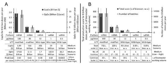 Once the most cost-effective production scale was identified for each of the five classes of RNA vaccines, we assessed the impact of variations in production efficiency on process performance and on the resources required to produce the 8 billion doses worth of LNP formulated RNA drug substance annually. Changes in production efficiency were modelled by changing the RNA titre in the production bioreactor by ±20% relative to the baseline value of 5 g·L−1. Thus, in the low scenario 4 g of RNA was obtained per L of bioreactor working volume, the medium scenario considered 5 g of RNA per L, and in the high scenario, 6 g of RNA was obtained per L of bioreactor working volume. The ±20% changes in titre are higher than what is expected for this process and this higher range can account for changes in the downstream purification efficiencies as well. The resources and production scales required to produce 8 billion doses of COVID-19 RNA vaccine DS annually based on the low, medium, and high scenarios for each of the five classes of RNA vaccines are shown in Figure 3 below. The medium scenario is shown by the bar charts and the low and high scenarios are illustrated with the low end and high end of the error bars, respectively. The annual operating expenditure (OpEx) and the total capital expenditure (CapEx) required to produce 8 billion doses of RNA vaccine DS annually are shown on the right and left y-axes of Figure 3A, respectively, for the five vaccine types. The table below the x-axis also shows the medium scenario values for DS production CapEx, OpEx, and cost per dose. The CapEx required to produce 8 billion doses of RNA DS per annum drops from the USD 1.57–2.36 billion range in the case of 100 µg/dose mRNA vaccine to USD 11–16.5 million range in the case of the 0.1 µg/dose saRNA vaccine. Similarly, The OpEx drops from the USD 14.2–21.3 billion per year range to USD 30.2–45.3 million per year range when moving from a 100 µg/dose mRNA vaccine to a 0.1 µg/dose saRNA vaccine.