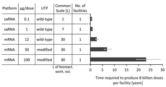 The total scale required to produce 8 billion doses of RNA DS per year decreases from the 610–915 L range in case of the 100 µg/dose mRNA vaccine to 0.57–0.86 L range in case of the 0.1 µg/dose saRNA vaccine, as shown on the left y-axis of Figure 3B and in the table below the x-axis of Figure 3B. The number of batches required to meet the yearly demand of 8 billion doses worth of RNA DS, assuming the feasible scales shown in the table below the x-axis, would decrease from the 9030–13,544 batches range for the 100 µg/dose mRNA vaccine to 271–407 batches range in case of the 0.1 µg/dose saRNA vaccine, as shown on the right y-axis of Figure 3B. In addition, the table below the horizontal x-axis in Figure 3B also shows the number of facilities required to produce 8 billion doses worth of RNA DS per year assuming one production line per facility at the common scale which was previously identified as techno-economically feasible. Thus, for the 100 µg/dose mRNA vaccine 21–31 facilities are required to produce 8 billion doses worth of RNA DS per year, depending on the production efficiencies, as described above. These 21–31 facilities would house one 30 L scale process per facility. On the other hand, to produce 8 billion doses worth of RNA DS per year for the next generation vaccine, which is assumed to have 0.1 µg/dose saRNA per vaccine dose, one facility with a 1 L scale process would be sufficient. Overall, the scales required to produce the LNP formulated RNA vaccine DS for meeting the global demand are substantially smaller than the scales required to produce DS using conventional mammalian cell-based approaches [25,49].