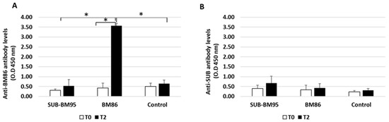 Anti-BM86 antibody titers increased significantly in cattle vaccinated with BM86, but not in cattle vaccinated with SUB-BM95 or controls after two immunizations (T2) (p < 0.05; Figure 1a). Antibody titers against BM86/BM95 did not increase in cattle vaccinated with SUB-BM95 when compared to controls (Figure 1A). In addition, no significant differences in anti-SUB antibody titers were observed in any of the groups when different immunization times and groups were compared (Figure 1B). These results confirmed the immunogenicity of BM86 and suggested that the combined SUB-BM86 chimeric antigen is not immunogenic, at least in cattle.