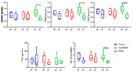 Values of antioxidant markers in vaccinated cattle with BM86, SUB-BM95, and control at T0 and T2. CUPRAC, cupric reducing antioxidant capacity; TEAC, trolox equivalent antioxidant capacity using horseradish peroxidase; FRAP, ferric reducing ability of plasma; total serum thiols and uric acid. The plots show median (line within box), 25th and 75th percentiles (box) and minimum and maximum values (whiskers). Asterisks indicate significant differences between times and immunization * p < 0.05.