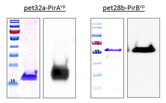 The expression of PirAvp and PirBvp was verified through Coomassie staining and Western Blotting. After purification using His resin, PirAvp was evident as a band at ~15 kDa (using His Ab for detection), while PirBvp was purified using Streptactin resin and a band evident at ~55 kDa size (using Streptactin-HRP for Western blot detection).
