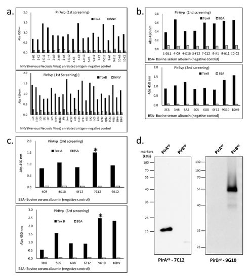 The capacity of the toxin-specific VLRBs to recognize their respective PirAvp and PirBvp antigens was verified by ELISA and Western blotting. Of the twenty 96-well plates that that were screened in the first round of ELISA screening, only 19 wells showed high binding with PirAvp and 24 wells with PirBvp (Figure 2a). Positive wells were serially diluted to obtain single cells, which were again screened by ELISA. In the second screening, eight cells from each of the PirAvp and PirBvp groups displayed a binding affinity to the antigen (Figure 2b). After the third round of screening, only one antibody for each group with the highest binding capacity was selected, namely PirAvp-7C12 and PirBvp-9G10 (Figure 2c). Western blot analysis of these two selected toxin-specific VLRBs showed specific binding to the respective toxin antigens, thereby, verifying the specificity of these antibodies for recognizing either PirAvp or PirBvp, respectively (Figure 2d).