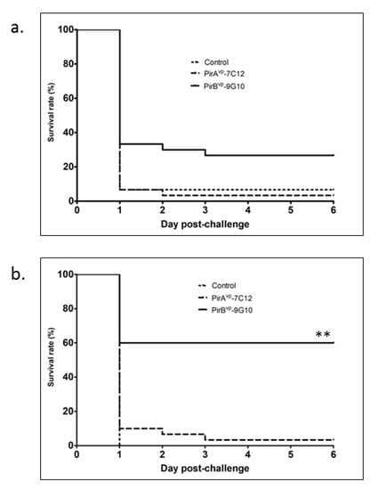 Survival data were statistically analyzed via Kaplan-Meier with the Chi-square test using GraphPad Prism v.5 software. Differences between groups were considered significant when ** p < 0.001.