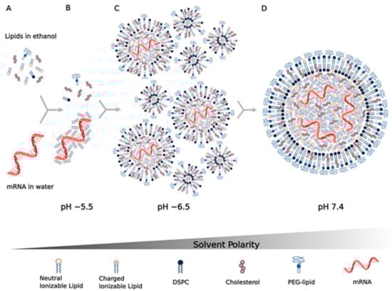 mRNA lipid nanoparticle assembly is achieved by (A) rapid mixing in a microfluidic or T-junction mixer of four lipids (ionizable lipid, DSPC, cholesterol, PEG–lipid) in ethanol with mRNA in an aqueous buffer near pH4. (B) When the ionizable lipid meets the aqueous phase, it becomes protonated at a pH ~5.5, which is intermediate between the pKa of the buffer and that of the ionizable lipid. (C) The ionizable lipid then electrostatically binds the anionic phosphate backbone of the mRNA while it experiences hydrophobicity in the aqueous phase, driving vesicle formation and mRNA encapsulation. (D) After initial vesicle formation, the pH is raised by dilution, dialysis or filtration, which results in the neutralization of the ionizable lipid, rendering it more hydrophobic and thereby driving vesicles to fuse and causing the further sequestration of the ionizable lipid with mRNA into the interior of the solid lipid nanoparticles. The PEG–lipid content stops the fusion process by providing the LNP with a hydrophilic exterior, determining its thermodynamically stable size, and the bilayer forming DSPC is present just underneath this PEG–lipid layer.