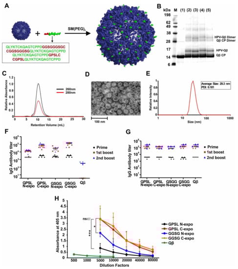 The HPV16 epitope L217–31 is ideal for the development of an effective HPV vaccine because it is highly conserved among diverse HPV isolates [15,16,17]. Different linkers and epitope orientations can have a significant effect on the immunogenicity of peptides [31,32], thus, we designed four peptides containing the L217–31 epitope, featuring alternative linkers (GPSL or GGSGGGSG) and orientations (epitope exposed at the N-terminus or C-terminus), as shown in Table S1. The peptides were conjugated to the surface of the VLPs derived from bacteriophage Qβ in a two-step procedure, where a bifunctional PEG was first conjugated via the NHS-chemistry to surface amines of Qβ. Next, terminal cysteines from the HPV epitopes were conjugated via a maleimide linker to the PEG-Qβ conjugate (Figure 1A). SDS-PAGE analysis of the products confirmed the presence of unmodified Qβ coat protein with a molecular weight of 14.2 kDa and an additional band at ~17 kDa, corresponding to the coat protein conjugated to the HPV peptide (Figure 1B). Unmodified and conjugated VLPs retained the dimeric assemblies under the electrophoresis conditions, as expected due to the relative strength of the dimeric interaction. The relative intensity of the bands indicated that ~30% of the Qβ coat proteins were conjugated to HPV peptides (GPSL-N-expo 32.2%, GPSL-C-expo 31.1%, GGSG-N-expo 33.8%, GGSG-C-expo 31.8%). FPLC analysis revealed a single peak, indicating that the VLPs were monodisperse and did not form aggregates (Figure 1C and Figure S1). DLS revealed that the diameter of the VLPs was 28 ± 3 nm, which was consistent with the TEM images (Figure 1D,E and Figure S1). These results indicated that the conjugation of HPV peptides did not alter the overall size or shape of the VLP as anticipated, given the low molecular weight of the peptides.