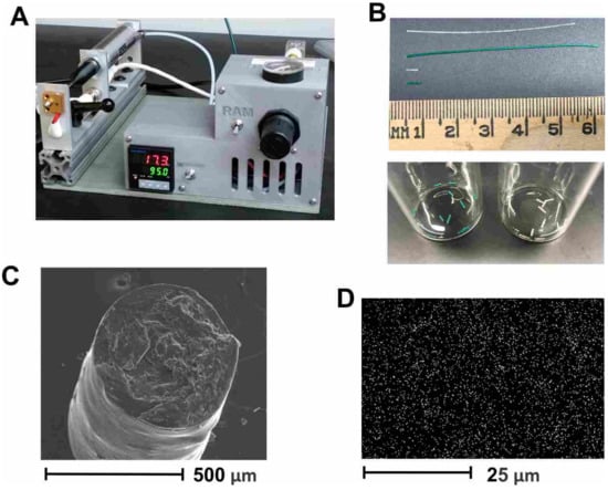 The preparation and characterization of melt-extruded PLGA implants. (A) Equipment for the melt processing of polymer materials. (B) PLGA implants produced by melt extrusion. The long implant bar produced directly from the device is shown at the top, with the short sections ready for implantation shown underneath. The photograph shows a metric ruler. The white bars are plain PLGA + Qβ-HPV, and the green ones are FITC-PLGA + Cy5-Qβ. (C) SEM image showing a cross-section of the PLGA implant loaded with Qβ-HPV. (D) The EDX spectrum sulfur K-series emission signal (SK series) map of the PLGA implant loaded with Qβ-HPV.