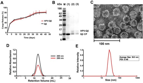 Here, we developed a single-dose HPV vaccine in which L2 peptide antigens from the high-risk HPV16 strain were displayed on the surface of VLPs derived from bacteriophage Qβ, a carrier used in several other vaccine candidates [26,27]. We chose a bioconjugate chemistry protocol to achieve multivalent presentation of L2 antigens on the Qβ carrier. A combination of size exclusion chromatography (SEC), transmission electron microscopy (TEM), and dynamic light scattering (DLS), and gel electrophoresis was performed to validate the structural integrity and epitope display of the HPV-Qβ. Immunogenicity was validated in healthy mice and the antibody titers and subtypes were determined using the ELISA-based protocols. The HPV-Qβ particles were then encapsulated in poly(lactic-co-glycolic acid) (PLGA) implants, using a benchtop melt-processing system, and implanted into mice. We monitored the release rate of the VLPs in vitro and in vivo and confirmed that the HPV-Qβ particles released remained intact. Finally, immunizations were carried out by comparing the implant vs. soluble injections. Data showed that the antibody titers generated by the single-dose HPV-Qβ/PLGA implant were equivalent to traditional injection schedules and played a neutralizing role against the HPV pseudovirus.