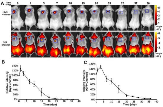 2.8. Analysis of Cy5-Qβ Loaded FITC-PLGA Implants In Vivo