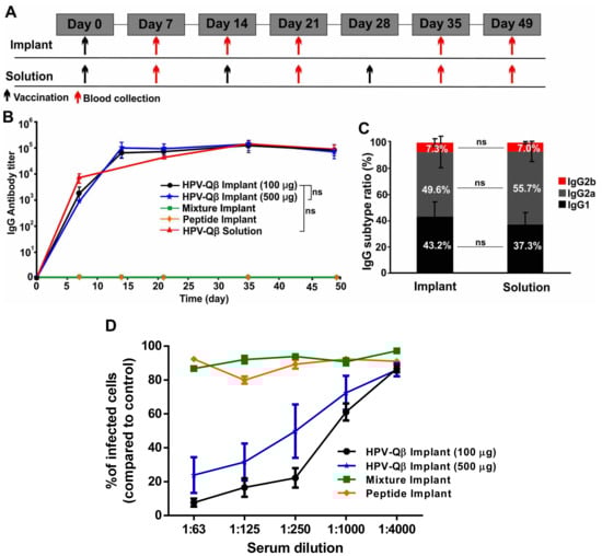 For vaccines in solution, female BALB/c mice aged 8 weeks were vaccinated subcutaneously by injection on days 0, 14, and 28, with blood collected 7 days after each vaccination. For the PLGA implants, mice were vaccinated by subcutaneous implantation, as described above, and blood was collected on days 7, 14, 21, 35, and 49. To compare the different HPV-Qβ conjugates, n = 5 mice were immunized three times with 30 µg of the specific HPV-Qβ conjugate (or the Qβ as a control). For the conjugates vs. mixture vs. peptide experiment, n = 6 mice were vaccinated with 30 µg of the specific HPV-Qβ conjugate, a mixture of 30 µg Qβ and 5 µg of the HPV peptide, or 5 µg of the HPV peptide alone. For the evaluation of single-dose vaccination using the loaded PLGA implants, the PLGA implants were subcutaneously introduced into n = 6 mice. The implants contained 100 µg HPV-Qβ, 500 µg HPV-Qβ, a mixture of 100 µg Qβ, and 20 µg HPV peptide, or 20 µg HPV peptide alone. To make a direct comparison among the three different vaccination techniques, three different groups of mice each comprising n = 6 mice were vaccinated subcutaneously with a single dose of 100 µg of the HPV-Qβ conjugate, three doses of 30 µg of the HPV-Qβ conjugate, and a single dose HPV-Qβ-loaded PLGA implants, loaded at 100 µg. Sera were separated from the collected blood through centrifugation at 2000× g for 20 min and were stored at 4 °C (short term) or −80 °C (long term).