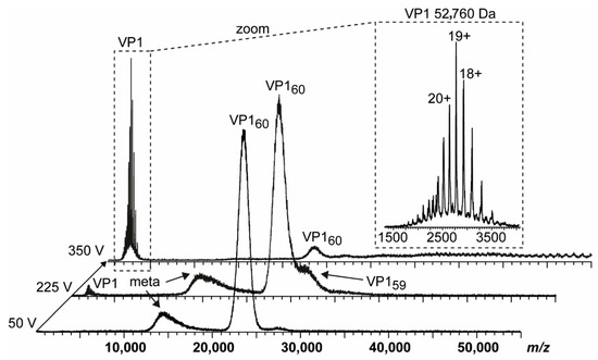 Native MS of a GI.1 West Chester batch forming merely VP160 complexes. Dissociation pathway without selection in the quadrupole is shown for GI.1 West Chester in 250 mM ammonium acetate pH 7 at 10 µM VP1. From bottom to top, illustrative mass spectra are shown for 50, 225, and 350 V acceleration into the collision cell. While at 225 V, VP1 monomers dissociate with the main population of VP1 60-mer still intact, the signal ratio of VP1 monomer:60-mer is reversed at 350 V. An insert shows a zoom of dissociated VP1 monomer with annotated charge states and average mass. As lower mass ions at approximately 15,000 m/z are annotated as metastable ions (meta), monomer lacking at least 40 aa most likely dissociate from T = 1 species.