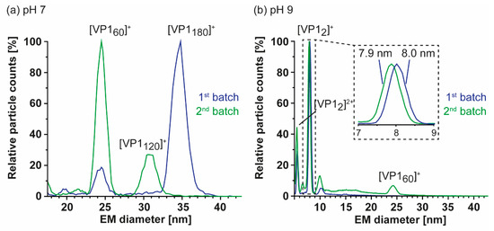 Furthermore, we characterized particle size and stoichiometry in further detail using nES GEMMA. Measurements of both GI.1 West Chester preparations are superimposed in Figure 3. In order to exclude artefacts, all samples were measured at different dilutions (Supplementary Figure S2). Putative artefacts included unspecific, nES-based aggregates at high sample concentrations, as well as multiply charged particles obtained at low percentage values during charge equilibration in the bipolar atmosphere of the spray chamber. Comparison of both batches at neutral pH reveals a clear shift in particle size and their counts. In the first GI.1 West Chester batch, most prominent particle counts were at 34.37 ± 0.13 nm, which was assigned to T = 3 particles. Further particle counts at 8.10 ± 0.05 and 24.09 ± 0.27 nm were assigned to VP1 dimer and VP1 60-mer. nES GEMMA spectra of the second batch showed a predominant species at 24.50 ± 0.12 nm equaling T = 1, as well as a species with low counts at 30.71 ± 0.17 nm. The population at 30.71 nm was assigned to 6.24 MDa using VLP correlation fitting approximately 120 VP1 (Table S3) [28]. At pH 9, high-mass particles in batch 1 were fragile, complementing our previous findings with native MS [25], while the T = 1 VLPs in batch 2 were resistant to pH 9. Other particles in the second batch bigger than 24.18 ± 0.06 nm disappeared. Interestingly, comparing EMDs of this 60-mer species at neutral pH and pH 9 did not indicate swelling or shrinking of the particles. Notably, the VP1 dimers released in alkaline conditions were slightly smaller in the second batch in line with the observed truncation. Moreover, size difference was not observed for T = 1 particles in the two batches in line with an N-terminal truncation located at the inner face of the capsids. We can conclude that no T = 3 particles were detected with nES GEMMA in the second West Chester batch, which indicated that at least a certain amount of full-length or less truncated VP1 subpopulation was needed to form T = 3 particles. Intermediate-sized populations could stem from either truncated, full-length VP1, or a mixture.