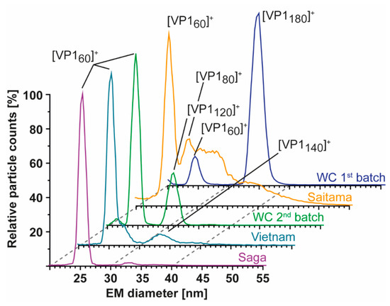 Size-distribution overview of different hNoVLPs with nES GEMMA. All variants are measured at 40 mM ammonium acetate pH 7 and approximately 2–10 µM VP1. From bottom to top GII.4 Saga (purple), GII.10 Vietnam (light blue), GI.1 West Chester batch 2 (WC, green), GII.17 Saitama (orange), and GI.1 West Chester batch 1 (WC, dark blue). West Chester batch 1 is shown as an indication of the expected EMD range for T = 3 particles. Assigned species are annotated. VP1 60-mers were detected in all variants, with less counts in WC batch 1. Next to 60-mers, GII.4 Saga and GII.10 Vietnam show distributions at approx. 33 nm assigned to VP1 140-mer, and WC second batch shows a distinct peak at 30 nm assigned to VP1-120mer. In GII.17 Saitama, at least two peaks can be fitted in the particle distribution accompanying VP1 60-mer annotated as VP1 80-mer and putatively VP1 180-mer.