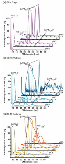Next to particle size distribution, the influence of solution pH was investigated. T = 1 particles, as well as higher-mass assemblies in GII.17 Saitama, were found to be pH-independent. Moreover, in preparations forming mainly T = 1 particles, like GI.1 West Chester batch 2, T = 1 particles showed increased stability in alkaline conditions. Therefore, truncated VP1 was able to build particles with increased stability. This implies great advances for bio-nanotechnology, as especially in approaches using VLPs as carrier particles, they need to be stable independently of environmental conditions. The contribution of the N-terminus to pH stability suggests a way to obtain S-particles of increased stability by truncation.
