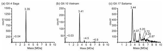 So far, several different size-populations have been detected outside the scope of the Caspar–Klug capsid assembly theory [41], where multiples of 60 (with 120 being formally not allowed) form particles of icosahedral symmetry. CDMS measurements in conditions comparable to our conventional QToF measurements at 250 mM ammonium acetate were used to unambiguously assign such assemblies (Figure 6). For GII.4 Saga, no species but T = 1 particles were observed in sufficient counts to fit peaks. Albeit peaks at approximately 33 nm appeared in low-salt nES GEMMA measurements, no respective peak could be assigned to VP1 140-mer with CDMS. At notably lower ion counts, GII.10 Vietnam showed T = 1 particles, as well as two further species with approximately 4.5 and 6.9 MDa assigned to VP1 79-mer and VP1 121-mer, respectively. Note that those species were approximations due to very low counts, and stoichiometry was based on assuming that 60 VP1 formed the 3.41 MDa population. For both variants, the VP1 mass inferred from the 60-mer was higher than determined in conventional native MS (CDMS/nMS: GII.4 Saga 55.8/54.6 and GII.10 Vietnam 56.8/55.6 kDa). This indicated mixed subpopulations of different VP1-size forming particles or less efficient desolvation in CDMS compared to QToF measurements. Notably, the species at 4.5 MDa was repetitive in GII.10 Vietnam, as well as GI.1 West Chester batch 1 (Supplementary Figure S4). In GII.17 Saitama, CDMS helped to elucidate mass heterogeneity observed in the other methods. Next to a distinct population of 3.44 MDa assigned to VP1 60-mer, five additional high mass species could be deconvoluted. CDMS clearly showed the absence of fully-formed T = 3 particles. Proteomics data for Saitama indicated a subpopulation of VP1 with a minor truncation of 3 aa. This subpopulation would putatively be able to form T = 3 particles in low amounts, which would likely be prone to disassemble at varying concentrations, ionic strengths, and pH levels. Given a mass of approximately 57.3 kDa, CDMS Saitama high-mass species fit VP1 71-, 91-, 100-, 108-, and 120-mers. In contrast, the stability at alkaline pH and low concentrations of these species suggested distinct assemblies. Particle size-heterogeneity was also observed using EM (Figure S5), where various larger assemblies were detected in GII.17 Saitama micrographs. Moreover, although formally not allowed according to triangulation theory, observed VP1 intermediates were repeatedly found in all tested variants and with different techniques.