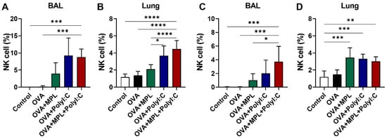 The following are available online at https://www.mdpi.com/article/10.3390/vaccines9101061/s1, Figure S1: Gating strategy of flow cytometry, Figure S2: NK cell purity after NK isolation by negative selection, Figure S3: Activation marker expression levels on the mature NK cell populations in lung after intranasal immunizations of OVA with adjuvants, Figure S4: Cytotoxicity mediated by NK cells after in vitro adjuvant treatment and in vivo immunizations with OVA + adjuvants, Figure S5: Cytokine production by isolated NK cells after in vitro adjuvant treatment, Figure S6: Induction of cytokine production after stimulation by MPL and Poly I:C in the lungs of C57BL/6 mice at prime and boost dose.