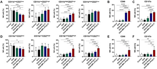 Murine NK cells are further differentiated based on the expression levels of CD11b and CD27. The CD11blowCD27low NK population is considered an immature NK cell phenotype, while the CD11blowCD27high NK cells are known to have a high potential for proliferation. CD11bhighCD27high and CD11bhighCD27low NK cells are the most mature NK cells, with limited proliferation capabilities but increased cytokine production and strong effector functions [30]. We found that the level of CD11blowCD27low NK cell subset was decreased, while the levels of CD11blowCD27high, CD11bhighCD27high, and CD11bhighCD27low NK subsets were increased in all the adjuvanted groups after both prime and boost immunizations (Figure 2A,D). In particular, after the prime immunization, the poly I:C and MPL + poly I:C combination adjuvant induced CD11bhighCD27high NK cells significantly compared with that in the Control, OVA-only or MPL-adjuvanted OVA groups (Figure 2A). After boost immunization, however, MPL + poly I:C combination adjuvant elicited significant NK cell maturation, not only CD11bhighCD27high but also CD11bhighCD27low (Figure 2D).