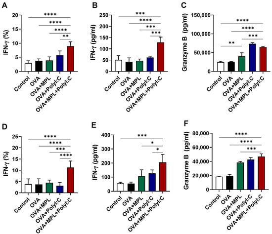 Cytokine production after intranasal immunizations of OVA with adjuvants. Lung samples were collected after one day post prime (A–C) and boost (D–F) immunizations. (A,D) The frequencies of IFN-γ-positive NK cells were analyzed by flow cytometry. (B,C,E,F) The concentration of IFN-γ and Granzyme B in lung homogenates were measured by ELISA. The data show the mean ± SD. Statistical analysis between groups were performed by one-way ANOVA and Tukey’s multiple comparison test. * p < 0.0332, ** p < 0.0021, *** p < 0.0002 and **** p < 0.0001.