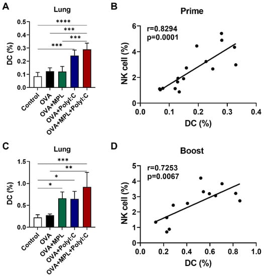 NK cells and DCs can interact with each other to regulate their activation by producing cytokines, and this interaction can influence the vaccine and vaccine adjuvant efficacy [9,13]. DCs initiate antigen-specific adaptive immune responses after the uptake and activation of antigens [7,32,33]. To evaluate the correlation between NK cells and DCs after the adjuvanted immunizations, we analyzed the total DC populations in the lungs after vaccination and performed correlation analysis between NK cells and DC populations. We found that the DC populations were significantly increased in the poly I:C and MPL + poly I:C adjuvanted groups after prime immunization (Figure 4A) and boost immunization with MPL, poly I:C, and MPL + poly I:C groups significantly enhanced the DC frequencies in the lung (Figure 4C). Strong correlations between DCs and NK cells were found after both prime and boost immunizations (r = 0.8294 and r = 0.7253, respectively) (Figure 4B,D).