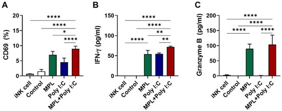 In vitro activation of immature NK cell from naïve mice by adjuvant pre-treated matured DCs. BMDCs were pre-activated by MPL, poly I:C, or MPL + poly I:C for two days, and then co-cultured with NK cell isolated from spleen cells of naïve C57BL/6 mice for two days. CD69 NK activation marker expressions were analyzed by flow cytometry (A), and IFN-γ (B) and Granzyme B (C) levels in culture supernatant were determined by ELISA. The data show the mean ± SD. Statistical analysis between groups were performed by one-way ANOVA and Tukey’s multiple comparison test. * p < 0.0332, ** p < 0.0021, and **** p < 0.0001.