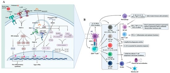 Immunity in malaria infection. A|Activation of dendritic cells. During the infection, both liver- and blood-stage parasites are recognized by the several PRRs present in the cells of the innate immune system. Majorly, monocytes, macrophages, and DCs have a significant role in the recognition. Vast literature has documented the TLR-mediated signals by parasite components, such as glycosylphosphatidylinositol (GPI), hemozoin, and DNA, upon infection. In addition, hemozoin and uric acid (released from the dying cells) activate the inflammasome. Furthermore, many other malaria parasite PAMPs are recognized by the different other unknown receptors and sensors. Once DCs/macrophages recognize the PAMPs and DAMPs, they phagocyte and process the pathogen, followed by the antigen presentation, to the T cells (reviewed in [25]). In addition, Plasmodium RNA (particularly in the hepatocytes) is sensed by the MDA5 ((RIG-I)-like receptor) and activates a type 1 IFN response via IRF3 and IRF7 signaling [26]. The above-mentioned innate immune responses help in the development of antigen-specific adaptive immunity. B|Activation of adaptive immunity. CD4+ T cells are activated by the DCs, and under the influence of cytokine milieu, CD4+ T cells are polarized into Th1, Th2, Th17, Treg, and Tfh cells. Each CD4+ T cell subset has a significant role in shaping the immune response (reviewed in [27]). NK cells perceive the signals by cytokines, which are produced from DCs, monocytes, and/or macrophages. Once activated, NK cells secrete inflammatory cytokines (IL-8, IFN-γ, TNF-α, CCL4, and others), which act as danger signals to gain other immune cells’ attention. NK cells also perform cytotoxicity as one of their main functions. NK cells either directly or indirectly kill the infected cells using perforin and granzyme and antibody-dependent cell cytotoxicity (ADCC), respectively. Antigen cross-presentation by DCs activates the CD8+ T cells, which produce IFN-γ upon activation. IFN-γ-producing CD8+ T cells perform inflammatory as well as cytotoxic (perforin and granzyme B mediated) functions. Though DCs induce a balanced immune response, the parasite could promote a severe pathology of cerebral malaria as a part of the immune evasion strategy [28].