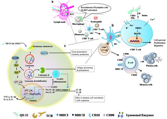 Proposed mechanisms of action of QS-21 in AS01 and QS-21 alone. a|Upon intramuscular injection, QS-21 (within the liposomes) drains to the lymph nodes and localizes at the subcapsular sinus (SCS) macrophages [240]. Macrophages activated via NLRP3 inflammasome pathways recruit other bystander cells including neutrophils, monocytes, and DCs [241]. b|QS-21 (within the liposomes) helps in the MHC-II and MHC-I antigen cross-presentation by forming a lipid body in the DCs and activating T cells [240,242]. Occasionally, in another way, QS-21 (alone) containing aldehyde moiety interacts with the T cell surface receptor (ε-amino acid) (e.g., CD2) and induces costimulatory signals [211]. These interactions, followed by ion exchanges (K+, Na+, Ca2+) and the activation of mitogen-activated protein (MAP) kinase, ERK2, and transcription factors, lead to cytokine release and cell proliferation, differentiation, and migration. c|QS-21 (within the liposomes) enters DCs via cholesterol-mediated endocytosis and situates itself in the lysosomes, where it destabilizes the lysosomes by forming size-specific pores. Cathepsin B (cysteine proteases) released from the lysosomes has an effective role in the immune functions mediated by QS-21. QS-21 (alone or in liposomes) activates the inflammasome (NLRP3), like other adjuvants, which induces active caspase 1 production. Activated caspase 1 coverts the pro-inflammatory cytokines (IL-1β and IL-18) into active forms [240].