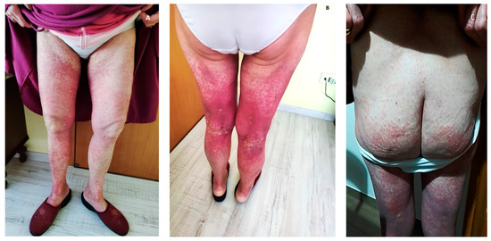 (A–C) Diffuse, non-whitening, maculopapular rash in both lower extremities.