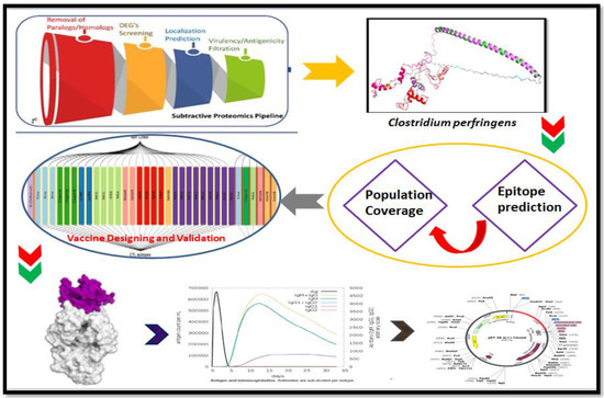 Novel therapeutic techniques are urgently required to battle against C. perfringens infections. In the present situation, the most favorable choice to permanently control emerging infectious diseases is vaccination [4,5]. Immunization and vaccination are highly effective methods that facilitate the immune- system in targeting and recognizing bacteria [5,6]. A subtractive genomic approach was utilized to study the genome core for the identification of appropriate vaccine candidates. Subtractive genomics is a computer-based approach for recognizing potential drug and vaccine targets by discarding proteins that are not helpful for drug and vaccine development [7]. For a variety of reasons, computational approaches are more competent than traditional methods, including safety, low cost, hypersensitivity, stability, specificity, and accuracy. The combination of immuno-informatics and subtractive genomics is currently making vaccines cost-effective and more attractive. The availability of a large amount of proteomic data allows us to anticipate bacterium proteins that are suitable for vaccine production [8,9]. The utilization of vaccine informatics and computational immunology methods to construct a multiple-epitope (MEV) vaccine that is non-allergenic, non-toxic, and free from fragments of unwanted peptides is getting popular, and is currently utilized prior to vaccinology experiments. These methods are effectively applied to different infectious, bacterial, and viral pathogens [10,11,12,13]. The key objective of immuno-informatics is to highlight safe, antigenic, and immunodominant epitopes, which could induce safe and strong immune responses against bacteria and fulfill all the standards of a good vaccine candidate [6,14].