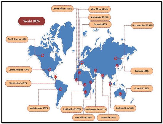 The frequency of the HLA allele changes among various geographical populations and ethnicities across the globe, which makes population coverage a vital parameter in the designing of the vaccine. In this study, the shared population coverage of selected epitopes with their associated allele of HLA was computed. This study represented the collective coverage of the global population for chosen epitopes of ~100% coverage. The maximum population coverage was recorded in South Asia, East Asia, and South East Asia, with a collective coverage of 100%. The lowest population coverage was reported in Central America (Figure 2). In brief, our investigation confirmed that the epitopes chosen would be good candidates for the construction of an MEV.