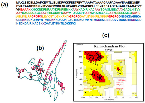 A multiple epitope was constructed using all epitopes that were selected. All epitopes of LBL, HTL, and CTL were combined by KK, GPGPG, and AAY linkers, respectively (Figure 3a). These linkers are beneficial because they enhance immunization and epitope performance while simultaneously inhibiting the development of junctional epitopes [61]. Moreover, B-chains of the Cholera enterotoxin (124 bp), acting as an adjuvant for the final vaccine design, was further joined at the N-terminal through an EAAAK linker (Figure 3a). The EAAAK linker was utilized because it enhances overall structural stability and deceases associations with other protein regions through effective detachment [62]. The final constructed multiple epitope vaccine presented 415 amino acids (Figure 3), exhibiting different epitope arrangements with their linkers.