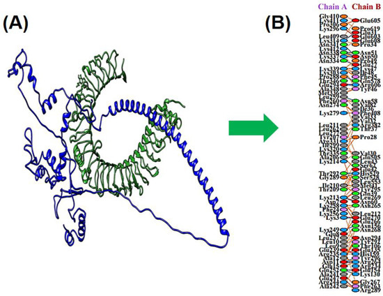 The TLR-4 is represented in green (Chain A) and the MEV is represented in blue color (Chain B). The section (A) in figure represent the vaccine and TLR-4 docking complex and the section (B) in figure represent interactions.