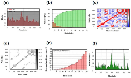 MD simulation of the MEV refined structure: (a) B-factor, (b) variance, (c) covariance matrix, (d) elastic network analysis, (e) eigenvalue and (f) deformability.