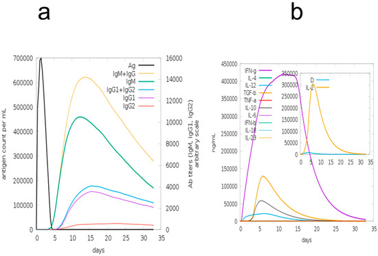 In silico immune reactions of multiple epitope-based vaccines from an antigen: (a) development of interleukins and cytokines; (b) immunoglobulin generation and isotopes of B-cells following exposure to the antigen in different states on the Simpson Index.