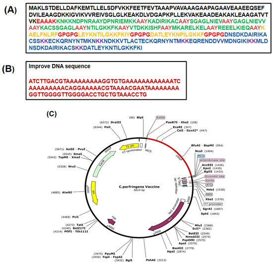C. Perfringens, a widely dispersed, Gram-positive, rapidly growing and opportunistic bacterium has become one of the most common bacteria that causes various enteric diseases in humans and animals, including enteric and histotoxic infections, non-food diarrhea, enterocolitis, and food poisoning [1,65]. Moreover, it causes gas gangrene in animals and humans [66]. The MEV discards non-essential elements, in contrast to traditional vaccines, which may cause abnormal reactions in the immune system or may have harmful effects [67]. Our main aim was to design a multiple epitope vaccine that may initiate a powerful immune reaction following vaccination, keeping all the benefits of multiple epitope vaccines in mind.