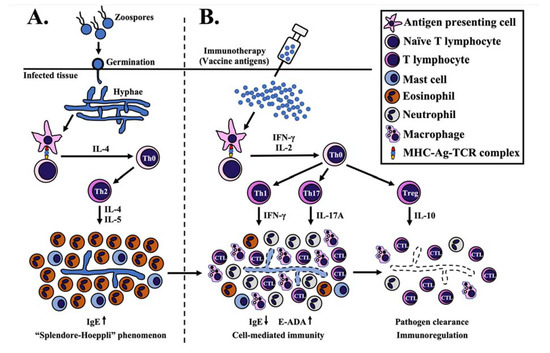 Proposed mechanism of P. insidiosum antigen (PIA) immunotherapy. (A) P. insidiosum’s zoospores (asexual stage) attach and germinate as hyphae into the host tissue during natural infection. Antigen-presenting cells (APC) process and present the P. insidiosum antigens to naïve T lymphocytes via major histocompatibility complex-antigen-T cell receptor complex (MHC-Ag-TCR). This interaction elevates some cytokines (mainly IL-4) to differentiate and clonally proliferate a naïve CD4+ T (Th0) to T helper-2 (Th2) cell, which, in turn, produces IL-4 and IL-5 to attract and activate eosinophils and mast cells. The eosinophils surround the P. insidiosum, creating the histological phenomenon called “Splendore-Hoeppli”. (B) Processed antigens (prepared from the crude extract of P. insidiosum) lead to forming the MHC-Ag-TCR complex that induces the release of some cytokines, mainly IFN-ϒ and IL-2. IFN-ϒ promotes differentiation and clonal proliferation of a Th0 to T helper-1 (Th1) cell. Th1 cell-produced IFN-ϒ attracts macrophages and cytotoxic T lymphocytes (CTL) to the infection site for eliminating the pathogen. The MHC-Ag-TCR complex also facilitates the differentiation of a Th0 to T helper 17 (Th17) cell to produce IL-17A and accumulate more macrophages and neutrophils at the infection area. On the other hand, IL-2 promotes the differentiation of a Th0 to regulatory T (Treg) cell to regulate or suppress an excessive immune response through the release of IL-10. See the text for the details and the references to the proposed mechanism of PIA immunotherapy.