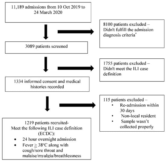 The selection of the patients for the study. The * admission diagnostic criteria as per the GIHSN format, included the following: For those aged 5 years old or more: acute upper or lower respiratory disease, acute myocardial infarction or acute coronary syndrome, acute asthma or exacerbation, acute heart failure, pneumonia and influenza, bronchitis and exacerbations of chronic pulmonary obstructive disease, acute respiratory failure, acute metabolic failure (diabetic coma, renal dysfunction, acid–base disturbances, alterations to the water balance), altered consciousness, convulsions, febrile convulsions, syncope and collapse, dyspnea, respiratory abnormality, shortness of breath, respiratory abnormality (not otherwise specified), respiratory symptoms/chest symptoms, fever or fever of unknown origin or non-specified cough, sepsis, systemic inflammatory response syndrome. For less than 5 years: acute upper or lower respiratory disease, dyspnea, breathing anomaly, shortness of breath, tachypnoea (polypnea), acute asthma or exacerbation, pneumonia and influenza, acute respiratory failure, acute heart failure, altered consciousness, convulsions, febrile convulsions, fever or fever of unknown origin or non-specified, cough, gastrointestinal manifestations, sepsis, systemic inflammatory response syndrome (not otherwise specified), nausea and vomiting.