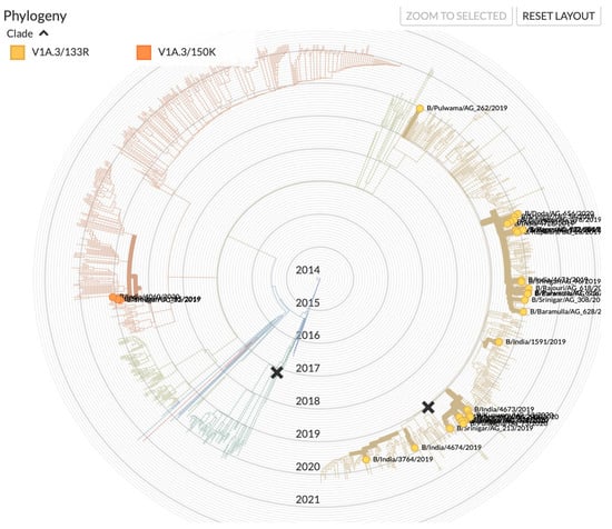 Phylogenetic tree of B/Victoria of samples in relation to the samples from India in the period under study. (source: www.gisaid.org accessed on 18 June 2021).