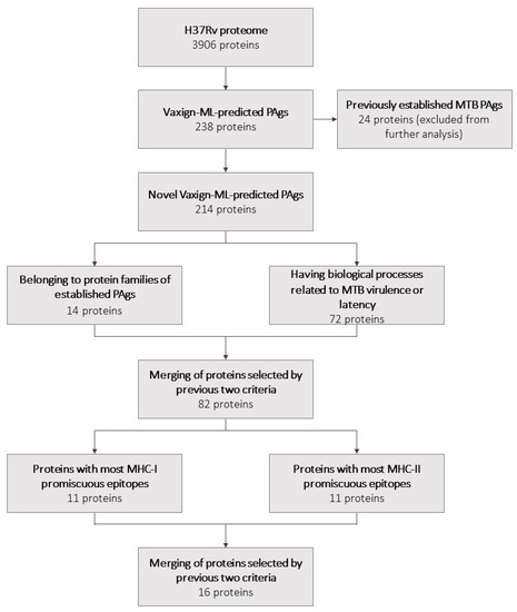 We then selected proteins with the previously recommended Vaxign-ML protegenicity score threshold [23]. Of these proteins, those that had previously been established as PAgs according to Protegen were excluded from selection so that all selected prospective PAgs were novel. Protegen is a web-based database that compiles PAgs of several pathogens, including MTB, which are curated from peer-reviewed articles [26]. The remaining proteins were designated as novel Vaxign-ML-predicted PAgs. This list of predicted PAgs was further refined using two independent criteria.