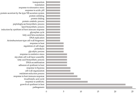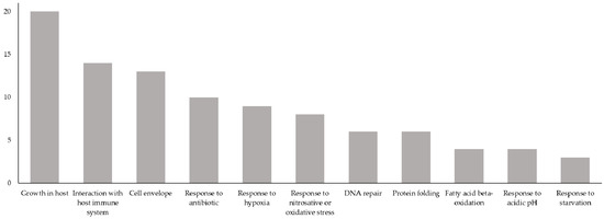Biological process categories of the 72 proteins having biological processes related to the virulence or latency of MTB. X-axis: biological process categories relevant to MTB virulence or latency; Y-axis: number of novel Vaxign-ML-predicted PAgs having a GO biological process belonging to a given biological process category. Total exceeds 72 because several novel Vaxign-ML-predicted PAgs have GO biological processes belonging to more than one biological process category.