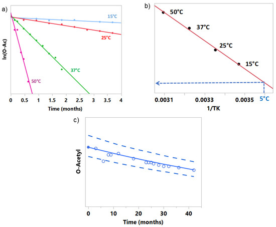 O-acetylation (OAc) content is one of the relevant quality attributes for GSK‘s conjugate vaccines’ immunogenicity, particularly for the meningococcal serogroup A component. A rate loss of O-Acetyl groups from the conjugate MenA component is expected over time and temperature, especially when the vaccine is presented in the liquid state. In this example, a first-order kinetics was identified to best describe the chemical reaction of loss of the O-acetyl moiety of a vaccine. Note that Equation (1) with n = 1 and m = 0 implies that the degradation can be described by a straight line when plotting the response on a logarithmic scale. During the development of a liquid formulation, stability data were collected on MenA polysaccharide stored at four temperatures: +15 °C, +25 °C, +37 °C, and +50 °C for a period of up to 16 weeks. The linear fit of experimental data presented in Figure 1a indicates that the first-order kinetics may be used here for describing the rate of chemical reaction of loss of the O-acetyl moiety. Arrhenius-based kinetic modelling was used to design the aging process for the investigational tailored vaccines with a predefined level of OAc MenA attribute to obtain the proven clinical specifications [11].