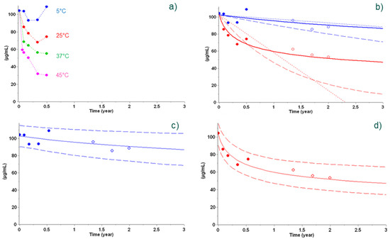 Stability data points used to build models (full circles) at +5 °C (blue), +25 °C (red), +37 °C (green), and +45 °C (pink) (a) and not used in the determination of the models (empty circles in panels (b–d)) overlayed with predictions from empirical models (zero-order in dotted lines and first-order in dashed lines in panel (b)) and best kinetic model (nth-order reaction in solid lines in panels (b–d). Prediction using the nth-order reaction in panels (c,d)) is shown with a 95% prediction interval (dashed lines). Reproduced from Clénet et al. (2014), Copyright © 2014, with permission from Elsevier.