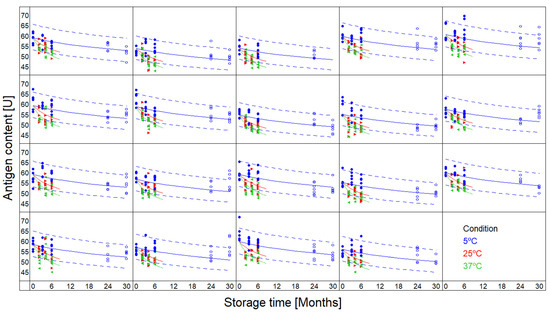 Antigenicity predictions based on vaccine 6 months’ data points (full circles) at +5 °C (blue), +25 °C (red), and +37 °C (green) for 19 batches. Antigenicity predictions at +5 °C are displayed as blue lines based on nth-order kinetics best fitting experimental data, including 95% two-sided prediction intervals (dashed-lines). Additional experimental data obtained later in time are displayed as open circles for verification.