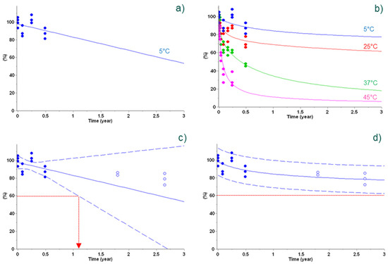 In this situation, considering 60% of antigenicity recovery as the lower acceptance level for this experimental vaccine and the lower predictive band, vaccine stability for at least 3 years at +5 °C can be claimed only using the best kinetic model (Figure 4, panel d), whereas the use of a poor model based on limited information (i.e., only +5 °C data) unrealistically shortens the proposed shelf-life (Figure 4, panel c).