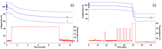 The examples in Figure 5 show real-life examples under fluctuating temperatures. Given the release value, the kinetic parameters, and the temperature profile, the time profile of the loss of antigenicity was predicted. The impact of the variable temperature on the degradation profile is clearly visible in the plots. At the end of the time frame, the actual antigenicity was measured and compared with the prediction, with actual data points falling within the prediction intervals, confirming the accuracy of the predictive models. Furthermore, the impact of successive excursions at ambient temperature experienced by a vaccine can easily be estimated. For the vaccine presented in Figure 5b, six short excursions around +22 °C did not have a significant impact on its antigenicity. These examples illustrate the power of the kinetic models in ensuring the quality of the products throughout their existence, from production to use.