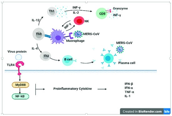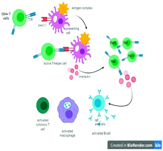 There is compelling evidence that the thymus is responsible for the development and differentiation of T lymphocytes. T lymphocytes mediate cellular immunity, providing a defense mechanism against intracellular microorganisms either through the direct killing of the cells that host microorganisms in their cytoplasm or the activation of other immune cells to destroy ingested microorganisms by the process of phagocytosis and productions of antibodies against specific antigens [,]. It has been reported that short chains of peptides that bind to MHC-I molecules are derived from degraded intracellular cytosolic proteins of microorganisms, including virus-mediated infections. On the other hand, peptides that bind to MHC-II molecules are derived from extracellular proteins of infectious agents []. The CD4+ T lymphocytes recognize antigens presented by MHC-II molecules, readily expressed on DCs, macrophages, and B lymphocytes []. Consequently, CD4+ T lymphocytes are activated and differentiated into one of several subsets of effector T helper (Th) lymphocytes, including, Th1, Th2, Th9, Th17, and Th22, which regulate the immune responses (Figure 2) by secreting cytokines []. Th2 lymphocytes also regulate the production of antibodies from B lymphocytes by secreting ILs such as IL-3, IL-4, and IL-5 and differentiation to antibody-secreting plasma cells []. Th17 has been reported to prevent mucosal respiratory viral infections in the lungs through recruiting macrophages and neutrophils, which ultimately clears pathogens, mediating inflammation, and maintaining tissue integrity []. Th17 lymphocytes have suppressed the detrimental tissue inflammations in viral infections. The exact underlying defensive mechanism of Th17 lymphocytes remains to be elucidated because lymphocytes-associated viral lung pathologies have been reported previously [].