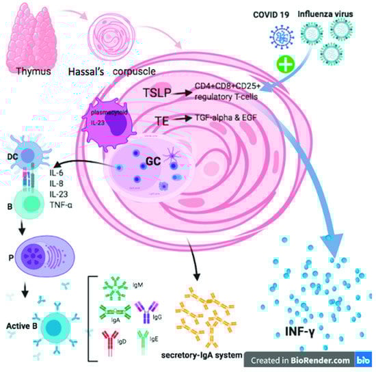 IL-1α/β enhances IgM and recruitment of CD4+ T cells at the site of infection but does not contribute to killing the virus-infected cell []. Additionally, CD4+ but not CD8+ Treg cells were suppressed by IL-6, allowing pathogen clearance and host survival in virus-induced infection []. In H1N1 influenza, IL-6 levels elevated in severe cases of virally infected patients [] and activated CD4+ CD8+ thymocytes and a large amount of IFNγ []. While IL-32 is a part of a negative feedback loop, inhibiting sIL-6R and upregulating IL-6 is essential for the survival of an influenza A virus infection [,]. Few immunodeficiency viral diseases have been linked with the thymus in childhood, including thymic lymphoid hyperplasia (thymitis), loss of Hassall’s corpuscles, and dysinvolution []. Hassall’s corpuscles were found to be altered and damaged in a 4-year-old boy infected with herpes simplex virus pneumonia and ependymoma []. Modulation in the size of the thymus has been associated with hyperactivation of dystrophic calcification of Hassall bodies, reflecting the decrease in the number of CD4+ cells in drug-addicted patients []. Lymphocytopenia is a noticeable portion of SARS-CoV contagion. It may be immune-mediated lymphocyte damage, bone marrow or thymus suppression, or cell programming death []. After a viral infection, lymphopenia is noticed in peripheral circulation [].