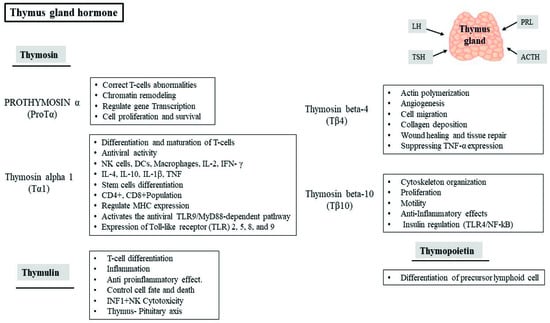 The thymus is a lymphoid organ involved in T lymphocyte maturation and differentiation. It is known that TECs can secrete IL-6 and granulocyte-macrophage colony-stimulating factor (GM-CSF) and thymic hormones in circulation, which promote thymocyte differentiation and proliferation and have anti-inflammatory effects. Thymic hormones (Figure 4) such as thymopoietin, thymosin alpha 1 (Tα1), and thymuline have a potential role in the differentiation and functions of lymphocytes, thus they may have the potential for T lymphocyte-related diseases. In addition, the thymus mediates neuroendocrine interactions directly affected by pituitary hormones, consequently affecting the neuroendocrine function of the thymus []. The active biological thymic peptides have been extracted and purified in a process called Thymosin Fraction V, along with several main peptides such as prothymosin α (ProTα), Tα1, thymosin beta-4 (Tβ4), thymosin beta-10 (Tβ10), and thymuline, for the maturation and differentiation of immature thymocytes [,,]. These peptides are biologically essential and known to activate the immune system through several mechanisms and signaling pathways, including stimulation of T cell differentiation and maturation, activation of NK cells, DCs, and induction of proinflammatory cytokine release []. The previous description indicates that thymic hormones can mediate anti-inflammatory effects, and future clinical trials are needed to translate them against inflammatory disorders and viral diseases []. In an experimental model of allergic asthma, a dose of DNA nanoparticles, including thymuline plasmids, could protect the lungs from some injurious inflammation and muscular hypertrophy, which recovered respiratory mechanical functions []. Mice were treated through intratracheal administration with a dose of thymuline-expressing plasmids administrated with nanoparticles to enable the thymuline to infiltrate the mucus barrier of the respiratory system [].