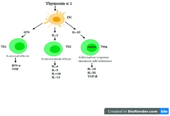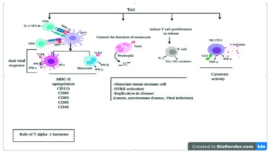 Tα1 is highly expressed in the thymus and peripheral tissues and produced through cleavage of ProTα in the thymus, pituitary, and brain []. Thymus hormones are targeted to control viral infectious diseases and inflammatory and autoimmune diseases [,]. Tα1, Tβ4, and Tβ10 displayed positive immunomodulatory effects by inducing Th lymphocytes (CD4+) and activating cytotoxic T lymphocytes (CD8+), maintaining immune homeostasis in viral infection [].