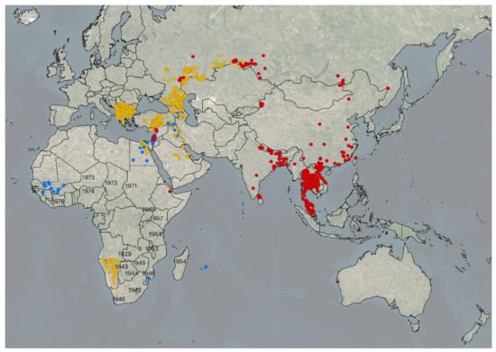 Geographical extent of lumpy skin disease outbreaks reported to EMPRES Global Animal Disease Information System of the Food and Agriculture Organization (https://empres-i.review.fao.org/#/, last accessed 23 September 2021) between January 2006 and May 2021. Outbreaks marked with blue dots were reported in 2006–2013, yellow in 2014–2018, and red in 2019–2021. LSD is endemic across the African continent, except in Algeria, Morocco, Libya, and Tunisia. Historical data from Africa were taken from Woods (1990) [8]. Black numbers indicate the year of the first recorded LSD outbreaks in the respective country.